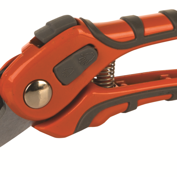 Jednoręczny sekator nożycowy (z dwoma ostrzami) o długości 21,5cm. Wyposażony w blokadę i antypoślizgową, ergonomiczną rączkę, która zmniejsza obciążenie dłoni i nadgarstka podczas pracy.