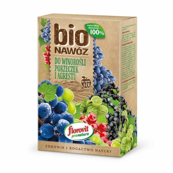 Florovit Pro Natura BIOnawóz do winorośli, porzeczek i agrestu - to granulowany, zawierający wyłącznie naturalne składniki nawóz BIO, przeznaczony do nawożenia winorośli, porzeczek i agrestu.Nawóz zawiera wszystkie składniki pokarmowe potrzebne do odpowiedniego wzrostu i plonowania roślin. Szczególnie polecany jest do stosowania na glebach o małej zawartości próchnicy. BIOnawóz przywraca biologiczną równowagę ogrodu. Stosowanie BIOnawozu poprawia właściwości gleby, a także powoduje doskonałe zatrzymywanie wilgoci w glebie.DAWKI I STOSOWANIE:Opakowanie 0,8 kg BIOnawozu wystarcza do nawożenia 15 – 20 m2 uprawy. Nawożenie najlepiej wykonać wiosną. Należy powtórzyć nawożenie latem po zbiorach oraz jesienią, co zapewni obfite owocowanie w następnym roku. Jeżeli istnieje możliwość zaleca się wymieszanie nawozu z wierzchnią warstwą gleby.Uprawy w gruncie – 40-50 g/m2Pojedyncze rośliny – 50-100 g na roślinę TERMINY STOSOWANIA:od IV do XSKŁAD NAWOZU:3,0% (N) azot całkowity; 3,0% fosfor całkowity w przeliczeniu na P2O5; 4,0% potas całkowity w przeliczeniu na K2O.