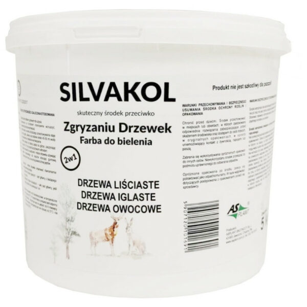 Silvakol to preparat w formie białej farby o działaniu odstraszającym, przeznaczonym do ochrony sadzonek i drzewek drzew liściastych i iglastych przed zgryzaniem przez zające, sarny i inne zwierzęta.Stosowanie:w okresie jesienno zimowym, kiedy zwierzęta zaczynają uszkadzać sadzonki nanosić na rośliny za pomocą pędzla lub rękawicy gumowej. Sadzonki i młode drzewka smarować równomiernie cienką wartwą środka:1. drzewa iglaste - pęd główny z bieżącego przyrostu2. drzewa liściaste - cały pęd główny jeślli jego grubość nie przekracza 1cm.Stosować w temperaturze powyżej 0 stopni Celsjusza, w dni bezdeszczowe. Po wyschnięciu prepart jest odporny na zmywanie i utrzymuje się na pędach do 6 miesięcy.Zużycie środka:- sadzonki 2-5 letnich drzew liściastych i iglastych: 50g/10 sadzonek (ogryzanie).