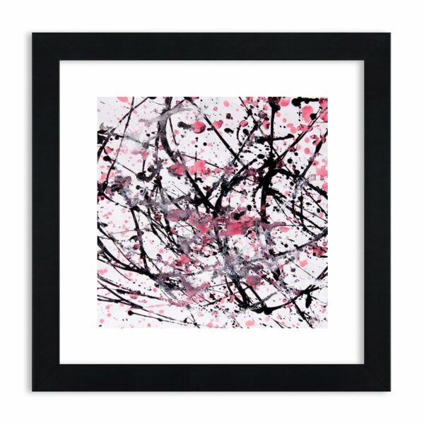 Plątanina plam i kresek w kolorze czarnym i amarantowym na białym tle. Czy ten gąszcz kresek nie kojarzy ci się z ciemnymi gałązkami obsypanymi różowymi pąkami?...