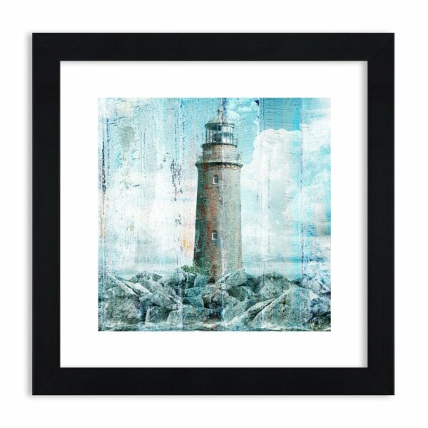 Wspaniała latarnia morska na kamiennej wyspie. Latarnia wilków morskich wybierających się na pełne morze. Technika przetarć podkreśla wiek budowli i nadaje jej surowy charakter…