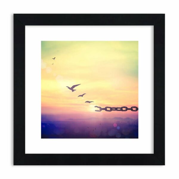 I poleciały… Ptaki fruwające po rozświetlonym niebie w kolorach złota i fioletu. Pęknięty łańcuch symbolizuje wolność i swobodę…
