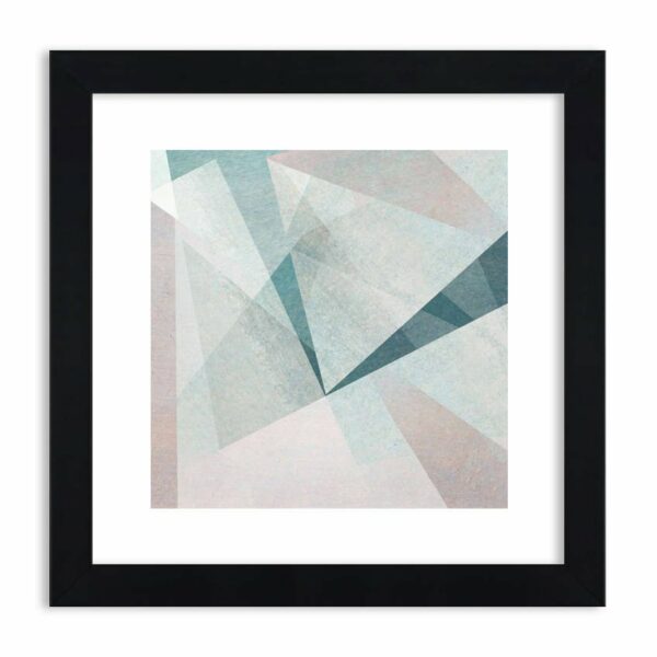 Trójkąty, wielokąty w kolorach pastelowych. Kompozycja sprawia wrażenie jakby to były ułożone pod różnym kątek tafle szkła, w których załamuje się światło. Spokojna kompozycja z pazurem…