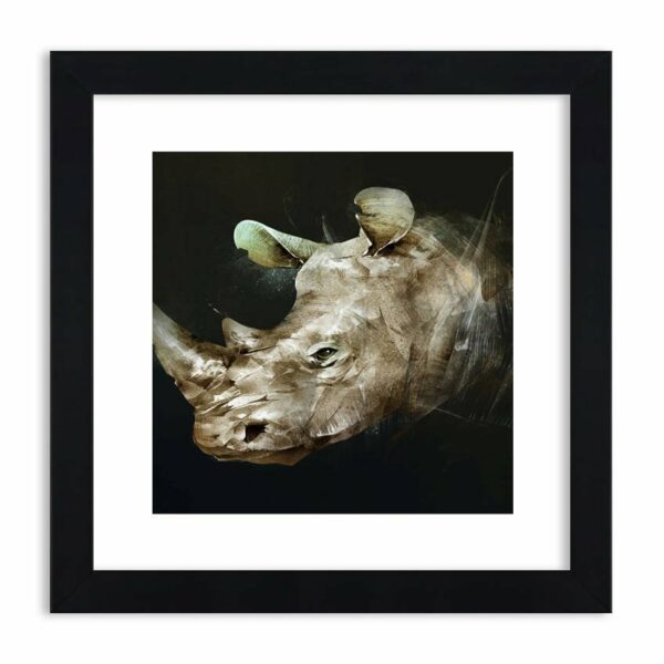 Portret nosorożca malowany grubymi pociągnięciami pędzla. Spójrz jak surowy i grożny jest jego wygląd...