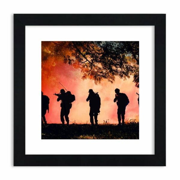 Misja pokojowa, albo bitwa. Żołnierze zgrani i solidarni jak dłoń. Pełne uzbrojenie i rozbłyskujący ogień wskazuje na wykonywaną akcję...