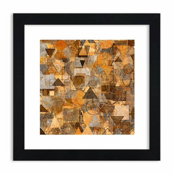 Zbiór figur geometrycznych: trójkąty, kwadraty, prostokąty i koła. Kompozycja w kolorze beżu i szarości sprawia wrażenie trójwymiarowej, a kolory podkreslają jej wielowarstwowość…