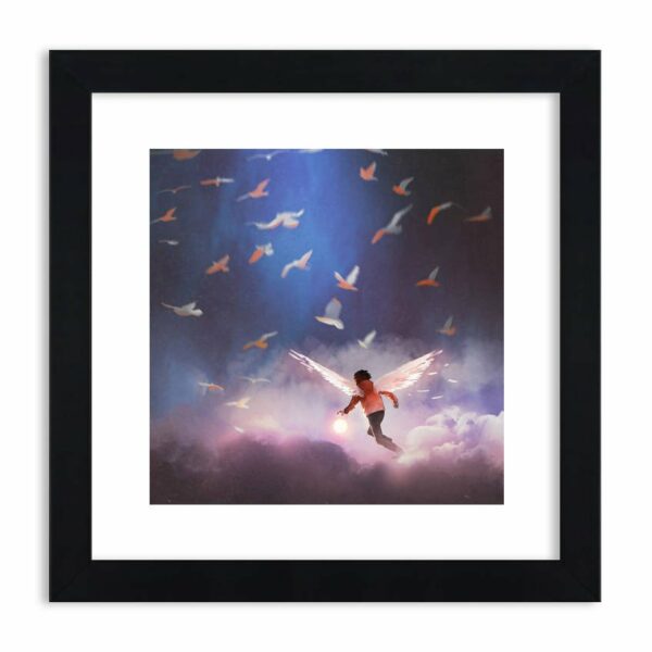 Współczesny Ikar na niebieskim niebie. Białe ptaki latające wokół nabierają pomarańczowych cieni w świetle słońca wychylającego się zza chmur. Obraz spokoju i harmonii….