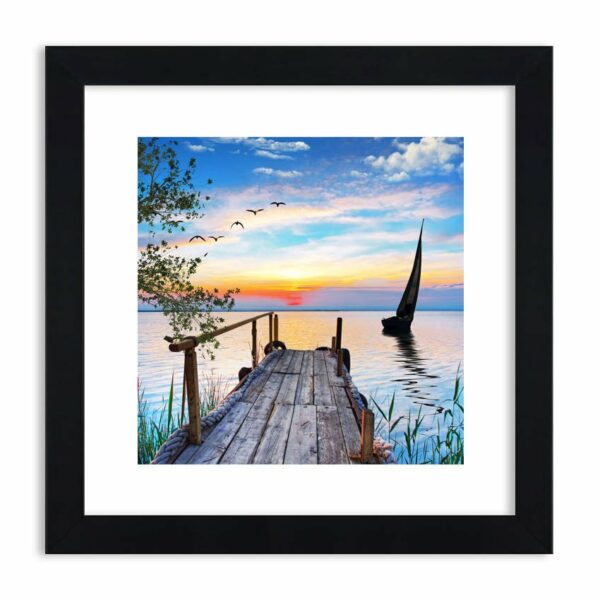 Spokojny powrót do domu. Drewniany pomost, zielone drzewo i szuwary, spokojna woda i żaglówka płynąca, by zacumować. A słońce, które właśnie zaszło ozłaca kolorami cały krajobraz…