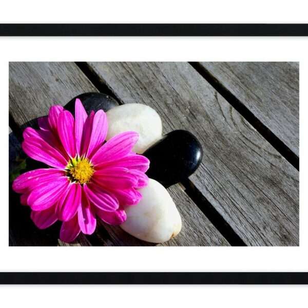 Surowe drewno desek, białe i czarne kamienie tworzą piękne tło dla amarantowego kwiatu z rozświetlającym, żółtym środkiem...