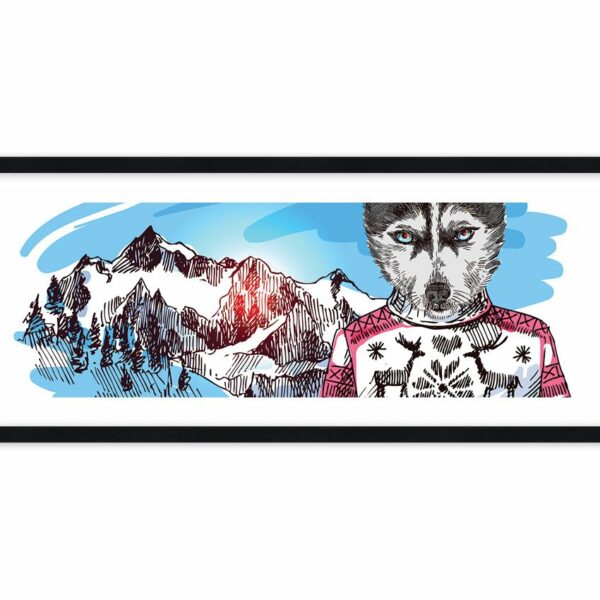 Dowcipny portret wilka albo psa w zimowym sweterku w jelonki. Ośnieżone szczyty gór i błękitne niebo podkreślają świąteczny charakter obrazu…
