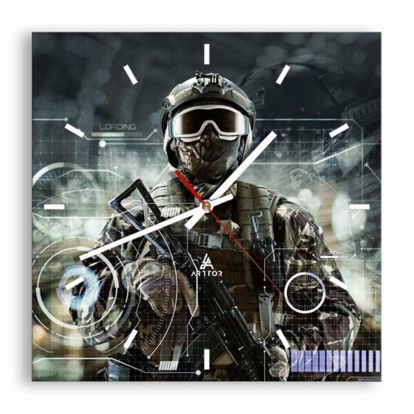 Żołnierz przyszłości. Pełne uzbrojenie w wersji przyszłych wojsk. Karabin, maska, hełm, wszystkie elementy wyposażenia konieczne do bitwy i dodatkowe wyposażenie elektroniczne…