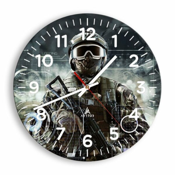 Żołnierz przyszłości. Pełne uzbrojenie w wersji przyszłych wojsk. Karabin, maska, hełm, wszystkie elementy wyposażenia konieczne do bitwy i dodatkowe wyposażenie elektroniczne…