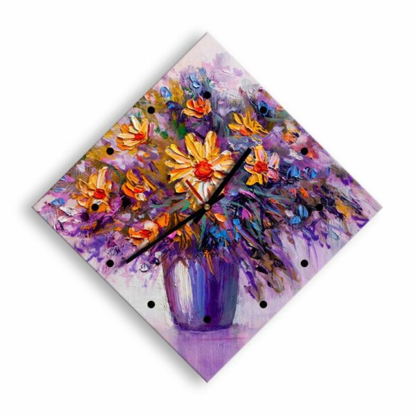 Bukiet pięknych kwiatów w jesiennym, pomarańczowym kolorze z niebieskimi akcentami. Fioletowy wazon i lilaróżowe tło podkreśla kolor kwiatów.