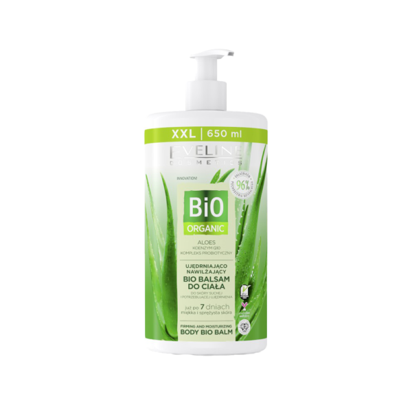 Eveline Bio Organic Balsam do ciała aloes 650ml:przeznaczony dla skóry suchej, dojrzałej i wiotkiej, Aloe Vera zawiera cenne witaminy A, C, wykazuje silne właściwości antyoksydacyjne, dzięki czemu spowalnia procesy starzenia, ponadto łagodzi podrażnienia i zaczerwienienia na skórze, koenzym Q10 skutecznie redukuje widoczność oznak starzenia się skóry, dodaje witalności oraz uelastycznia, kompleks probiotyczny głęboko i długotrwale nawilża, pozostawia skórę gładką i miękką w dotyku, Sposób użycia: Na czystą i suchą skórę zaaplikuj niewielką ilość kosmetyku. Delikatnie wmasuj w całe ciało i pozostaw do wchłonięcia. Stosuj codziennie, najlepiej od razu po kąpieli.