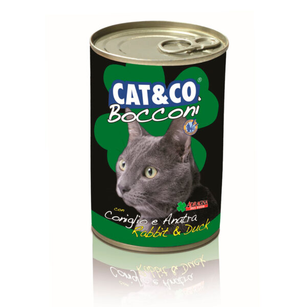 CAT&CO Kawałki z królikiem i kaczkąPełnowartościowa karma dla kotówSkład: Mięso i produkty pochodzenia zwierzęcego (królik 4%, kaczka 4%), ryba i pochodne ryb, minerały. Składniki analityczne: wilgotność 79%, białko surowe 8,5%, tłuszcze surowe 6%, włókno surowe 0,5%, popiół 3,0%. Dodatki:Dodatki odżywcze: Witamina E 10 mg/kg, Miedź 2 mg/kg.Instrukcja użytkowania: Produkt gotowy do spożycia. Nie trzeba podgrzewać. Zalecane dawkowanie: patrz tabelka z boku opakowania.Przechowywać produkt w chłodnym i suchym miejscu, z dala od promieni słonecznych.Po otwarciu, przechowywać w lodówce przez 2-3 dni.Należy spożyć przed: Patrz spód puszki.