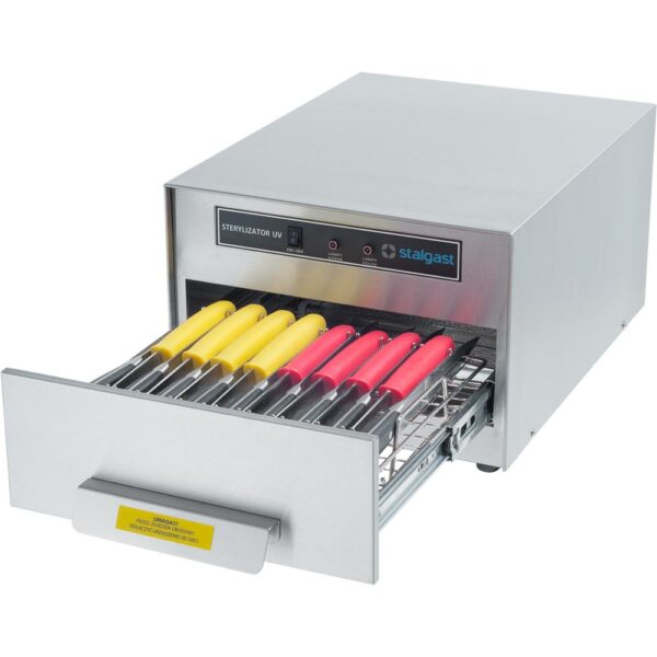 Naświetlacz uniwersalny:• Urządzenie z lampami UV do powierzchniowej dezynfekcji jaj, noży i przyborów• Można dezynfekować jednorazowo 30 sztuk jaj lub 17 sztuk noży o długości 320 mm i wysokości 40 mm• Czas naświetlania (sterylizacji): 150 sekund• Automatyczne wyłączenie lamp przy otwartej szufladzie• Kratka ze stali chromowanej.• W cyklu naświetlania ginie do 100% bakterii Salmonella, E. Coli, ziarenkowców, laseczek tlenowych, pałeczek okrężnicy i grzybów z powierzchni skorupki