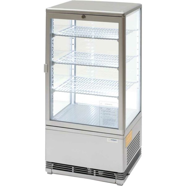 Witryna ekspozycyjna:• Oświetlenie LED• Wymuszony obieg powietrza• Pojemnik na skropliny• Automatyczne odszranianie• 3 regulowane półki w komplecie• Przeszklona z 4 stron