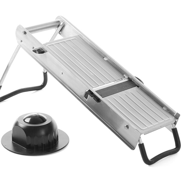 Posiada antypoślizgową podstawę. Można myć w zmywarkach.W zestawie: - uchwyt do trzymania warzyw,- 2 noże do krojenia w plasterki (1 nóż karbowany),- 3 noże do krojenia w słupki (5, 7, 10 mm),- pojemnik na noże.