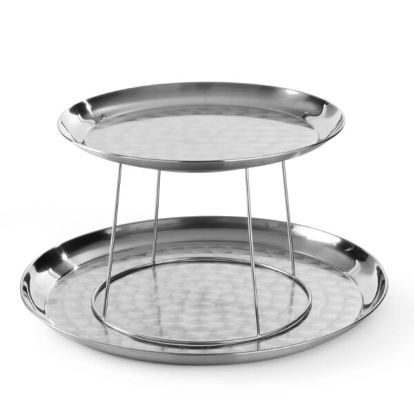 Wykonana ze stali nierdzewnej patera do owoców morza, wyposażona w dwie tace ze stali nierdzewnej o średnicach 300 mm i 400 mm oraz podstawę. Można myć w zmywarkach.
