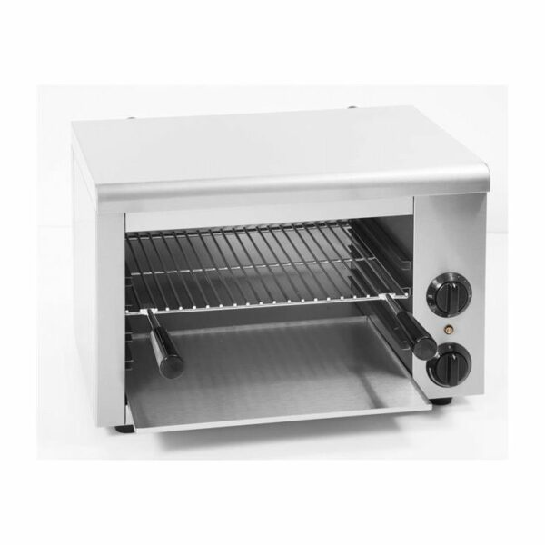 Płynna regulacja temperatury od 50°C do 250°C.Idealny do grillowania, do zapiekanek i do podgrzewania potraw.Grzałka umieszczona na górze.Termostat, timer do 15 minut, lampka kontrolna.Regulacja wysokości rusztu - 4 pozycje.Ruszt z rączkami oraz tacka na okruchy w zestawie.Wymiary wewnętrzne: 400x300x(H)200 mm.