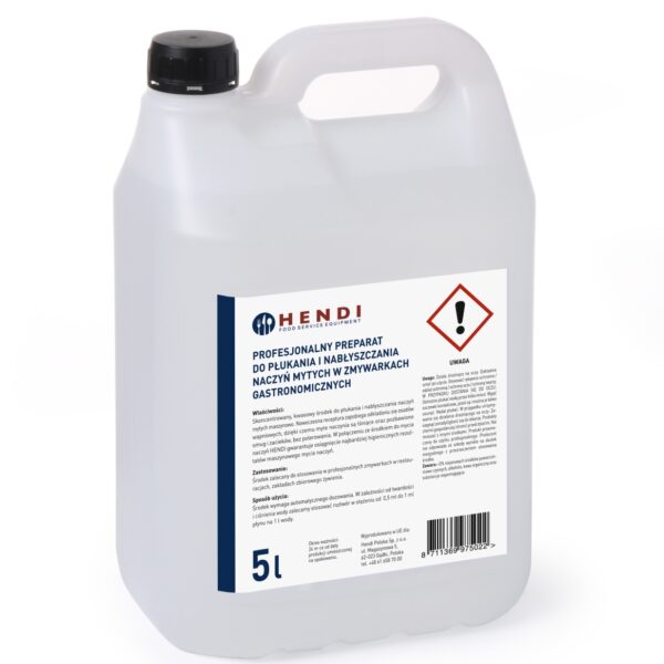 Skoncentrowany, kwasowy środek do płukania i nabłyszczania naczyń mytych maszynowo oraz do urządzeń gastronomicznych - polecany do stosowania w piecach konwekcyjno - parowych wyposażonych w automatyczne systemy myjące.Nowoczesna receptura zapobiega odkładaniu się osadów wapniowych, dzięki czemu myte naczynia są lśniące oraz pozbawione smug i zacieków, bez polerowania.W połączeniu ze środkiem do mycia naczyńHENDI gwarantuje osiągnięcie najbardziej higienicznych rezultatów maszynowego mycia naczyń oraz urządzeń.