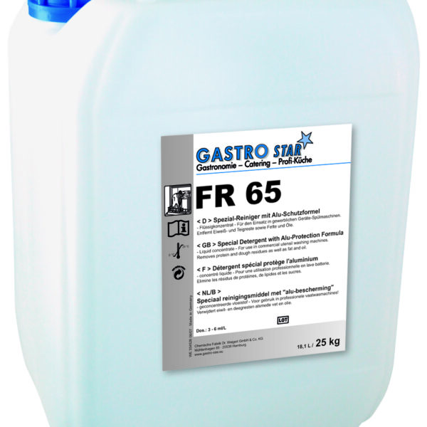 Specjalny środek myjący FR-65 także do aluminium, skutecznie usuwa białko, ciasto, oleje oraz tłuszcze. Specjalny środek myjący do profesjonalnych zmywarek.