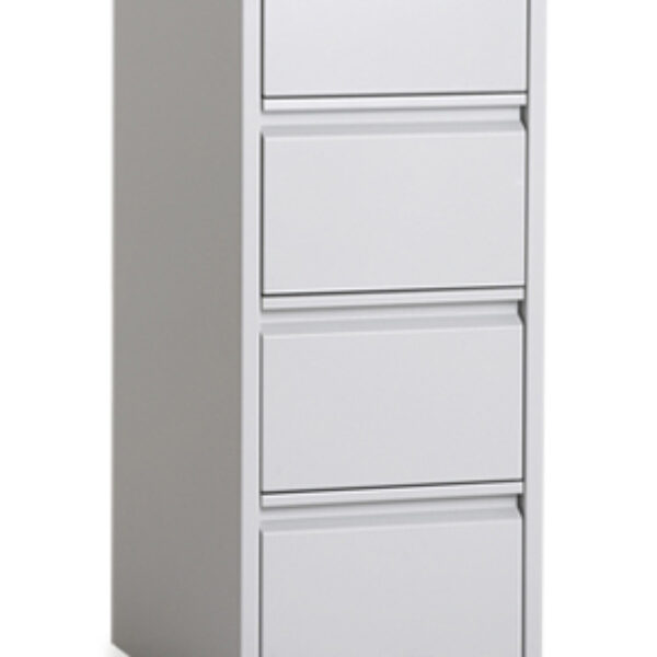 Czteroszufladowa szafa przystosowana do przechowywania kartotek formatu A-5. Szuflada posiada przegrodę umożliwiającą ułożenie dwóch rzędów kartotek w pionie. Wykonana jest z blachy czarnej o grubości od 0,6mm- 2 mm, malowana farbami proszkowymi (epoksydowo-poliestrowymi) w kolorze RAL 7035. Szuflady przesuwają się po prowadnicach teleskopowych z blokadą zabezpieczającą przed wypadnięciem. Całość zamykana jednym centralnym zamkiem. Maksymalne obciążenie prowadnic szuflady: 45kg. Szafa posiada blokadę pozwalająca na wysunięcie tylko jednej szuflady, co zachowuje jej stabilność.