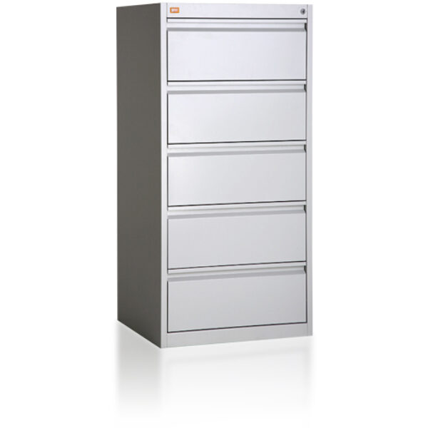 Pięcioszufladowa szafa przystosowana do przechowywania kopert formatu B-5 w poziomie. Szuflada posiada przegrodę umożliwiającą ułożenie dwóch rzędów kopert. Wykonana jest z blachy czarnej o grubości 0,6mm- 2,0 mm, malowana farbami proszkowymi (epoksydowo-poliestrowymi) w kolorze RAL 7035. Szuflady przesuwają się po prowadnicach teleskopowych z blokadą zabezpieczającą przed wypadnięciem. Całość zamykana jednym centralnym zamkiem. Maksymalne obciążenie prowadnic szuflady: 80kg. Szafa posiada blokadę pozwalająca na wysunięcie tylko jednej szuflady, co zachowuje jej stabilność.