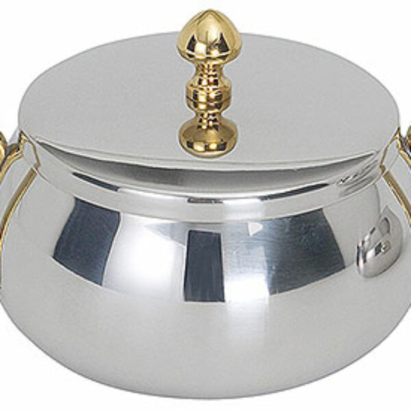 Cukiernica z polerowanej stali nierdzewnej z pozłacanymi uchwytami. Pokrywa sprzedawana oddzielnie.