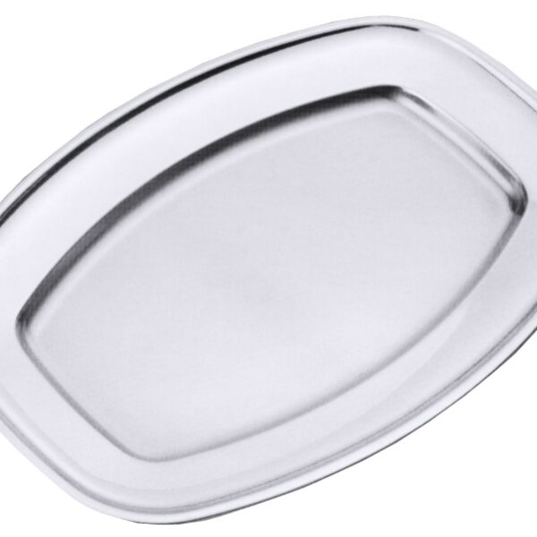 Półmisek na mięso lub wędliny wykonany z satynowanej stali nierdzewnej z polerowanym, wywiniętym rantem.