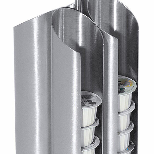 Dyspenser z satynowanej stali nierdzewnej z pokrytą gumą podstawą na około 24 śmietanki do kawy.