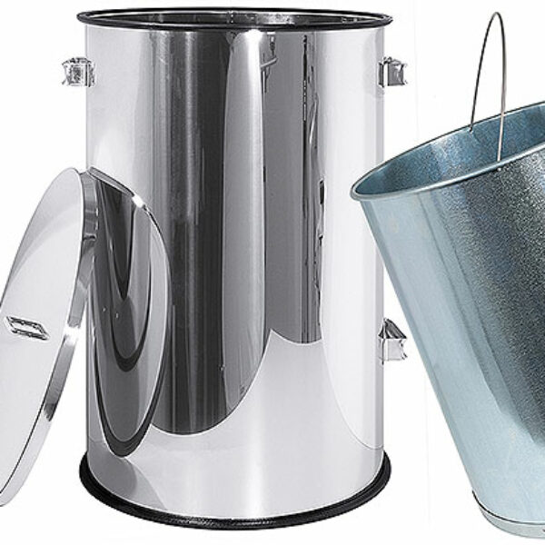 Kosz na śmieci z polerowanej stali nierdzewnej z pokrywką. Środek z galwanizowanej stali. Podstawę na kółkach należy dokupić osobno.