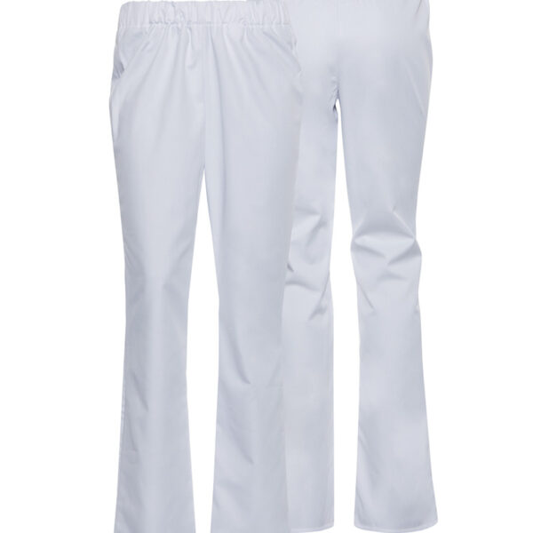 Spodnie damskie, sanforyzowane, 65% PES, 35% bawełny, 215 g/m2. Spodnie wykonane z wysokogatunkowej tkaniny, elastyczne w pasie. Można prać w pralce automatycznej w temperaturze do 95 stopni Celsjusza i prasować w temperaturze do 150 stopni Celsjusza. Nie wybielać i nie suszyć w suszarce automatycznej. Można poddać profesjonalnemu czyszczeniu chemicznemu.
