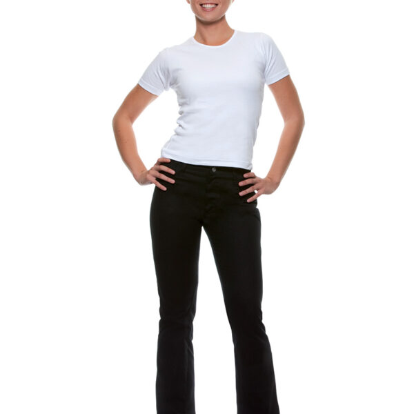 Spodnie damskie, sanforyzowane, 97% bawełny, 3% EOL, 270 g/m2. Wysokość do bioder, szyte na jeansowy styl. Tkanina strech DOW XLA, zapinane na zamek błyskawiczny z szlufkami na pasek, z dwiema kieszeniami z przodu i z tyłu. Można prać w pralce automatycznej w maksymalnej temperaturze do 95 stopni Celsjusza, wybielać, suszyć w suszarce automatycznej w programie „delikatne”, prasować w maksymalnej temperaturze 200 stopni Celsjusza oraz poddawać profesjonalnemu czyszczeniu chemicznemu.