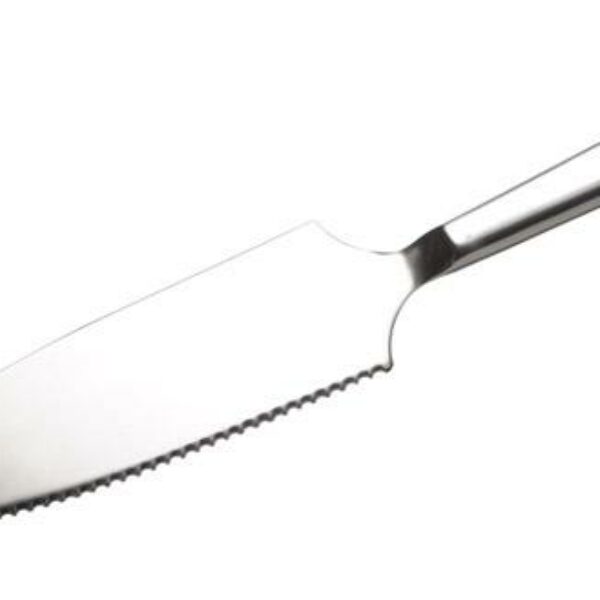 Nóż wykonany ze stali nierdzewnej do porcjowania ciast. Wymiary ostrza 45 x 10 mm. Można myć w zmywarkach.
