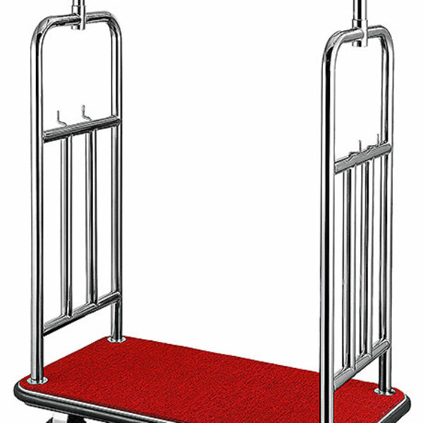 Wózek transportowy ze stali nierdzewnej na kółkach o średnicy 200 mm z gumowymi zderzakami i powierzchnią transportową wyłożoną czerwonym materiałem.