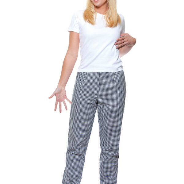 Spodnie damskie, 100% bawełny, 270 g/m2. Plisowane spodnie w pipetkę z dwoma bocznymi kieszeniami i elastycznym pasem. Zapinane na zamek błyskawiczny. Można prać w pralce automatycznej w maksymalnej temperaturze 60 stopni Celsjusza i prasować w temperaturze do 150 stopni Celsjusza. Nie wybielać, nie suszyć w suszarce automatycznej. Można poddać profesjonalnemu czyszczeniu chemicznemu.