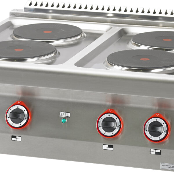 • W pełni profesjonalna kuchnia elektryczna Kromet, niezawodna i prosta w użyciu• Płyty: 4x 2,6 kW o średnicy 220 mm najlepszych europejskich producentów• Płyty szybkogrzejne o bardzo dużej żywotności• Ergonomiczne i duże pokrętła dla łatwej regulacji mocy z pierścieniami uszczelniającymi (zabezpieczenie antybryzgowe), zwiększające higienę• Sześciostopniowa regulacja mocy• Konstrukcja zapobiegająca zaciekanie wykipin do wnętrza kuchni• Płyta górna wykonana ze stali nierdzewnej o grubości 1,5 mm zapewnia niezawodność i wytrzymałość• Możliwość łatwego łączenia linii 700 na włos• Prosimy sprawdzić przydział mocy dla obiektu w którym będzie pracować urządzenie• Wyposażenie opcjonalne (za dopłatą): nakładki umożliwiające przesuwanie garnków pomiędzy płytami grzewczymi