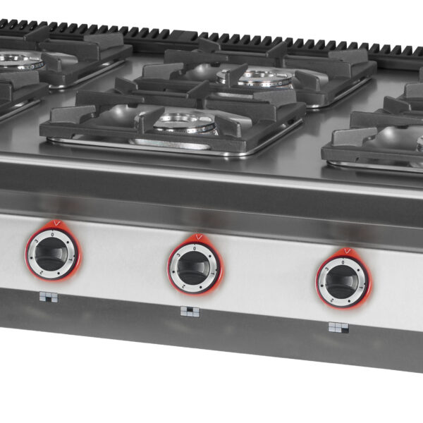 • W pełni profesjonalna kuchnia gazowa Kromet, niezawodna i prosta w użyciu• Palniki: 2x 4,5 kW o średnicy 106 mm, 2x 7,5 kW dwukoronowy o średnicy 126 mm, 2x 9 kW dwukoronowy o średnicy 126 mm• Energooszczędne palniki (płomień oszczędnościowy 25% maksymalnego zużycia gazu) z zabezpieczeniem przeciwwypływowym• Palnik pilotujący• Konstrukcja zapobiegająca zaciekanie wykipin do wnętrza kuchni• Dbałość o higienę - demontowalne misy, elementy palników oraz ruszta• Płyta górna wykonana ze stali nierdzewnej o grubości 1,5 mm• Ergonomiczne i duże pokrętła dla łatwej regulacji wielkości płomienia z pierścieniami uszczelniającymi (zabezpieczenie antybryzgowe), zwiększające higienę• Palniki renomowanej włoskiej firmy ARC• Palniki dwukoronowe zapewniają dużą moc, jednocześnie ograniczając zużycie gazu podczas użytkowania• Możliwość dopasowania mocy palników• Funkcjonalne urządzenie dla WOKa• Możliwość łatwego łączenia linii 900 na włos• Przyłącze gazu: R 1/2”• Przed zamówieniem prosimy określić rodzaj gazu (z sieci, z butli)• Wyposażenie opcjonalne (za dopłatą): nakładki redukcyjne, nakładka: płyta gładka, nakładka: płyta ryflowana