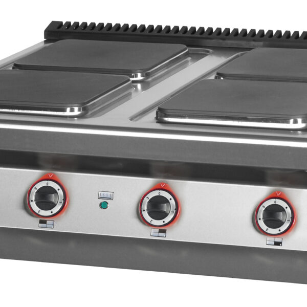 • W pełni profesjonalna kuchnia elektryczna Kromet, niezawodna i prosta w użyciu• Płyty: 4x 4 kW o rozmiarze 300x300 mm najlepszych europejskich producentów• Płyty szybkogrzejne o bardzo dużej żywotności• Ergonomiczne i duże pokrętła dla łatwej regulacji mocy z pierścieniami uszczelniającymi (zabezpieczenie antybryzgowe), zwiększające higienę• Sześciostopniowa regulacja mocy• Konstrukcja zapobiegająca zaciekanie wykipin do wnętrza kuchni• Płyta górna wykonana ze stali nierdzewnej o grubości 1,5 mm zapewnia niezawodność i wytrzymałość• Możliwość łatwego łączenia linii 900 na włos• Prosimy sprawdzić przydział mocy dla obiektu w którym będzie pracować urządzenie• Wyposażenie opcjonalne (za dopłatą): nakładki umożliwiające przesuwanie garnków pomiędzy płytami grzewczymi