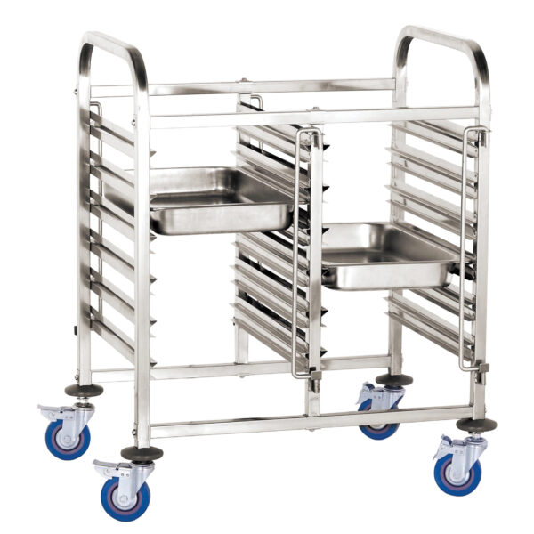 Na 12 pojemników GN 1/1. Odległość między poziomami 80 mm. Posiada obustronne zabezpieczenie przed wypadnięciem pojemników. Wyposażony w 4 skrętne kółka, 2 z hamulcami.