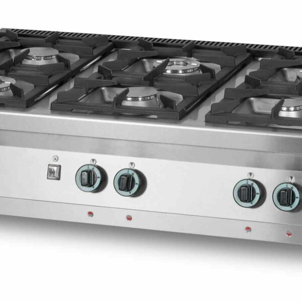 Zestawienie naszych nowoczesnych urządzeń w zwartej zabudowie liniowej lub wyspowej, tworzy funkcjonalny ciąg technologiczny do obróbki żywności, a także poprawia estetykę każdego profesjonalnego zaplecza kuchennego. Urządzenia zmontowane są jako moduły górne na szafkach, podstawach, belkach pomostowych. Różnorodność urządzeń grzewczych oraz kombinacji szafek i podstaw pozwala zestawić dowolna konfiguracje linii, spełniająca oczekiwania każdego użytkownikaDodatkowe informacje: - Wymiary: 1350 x 900 x 280 / 310 mm- Wymiary z podstawa: 1350 x 700 x 900 mm- Przyłącze gazu: R½”- Gazy: E, H, Lw, Ls, B/P, P- Zasilanie elektryczne: ~ 230 V, 50 Hz- Moc palników: 2 x 4,5 kW +2 x 7,5 kW + 2 x 9 kW = 42 kW- Palniki pilotowe- Zapalanie: generator wysokonapięciowy- Zabezpieczenie przeciwwypływowe- Płomień oszczędnościowy 25 % zużycia gazu- Palniki 9 kW i 7,5 kW dwukoronowe- Ruszty do gotowania żeliwne, pokryte emalia ceramiczna