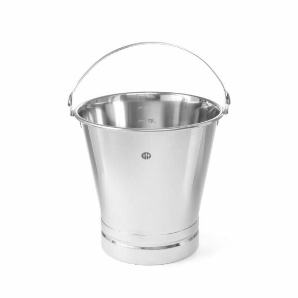 Wiadro z pierścieniem wykonane ze stali nierdzewnej. Podziałka wewnątrz wiadra. Wzmocniona podstawa zapewniająca stabilność i higieniczne użytkowanie.