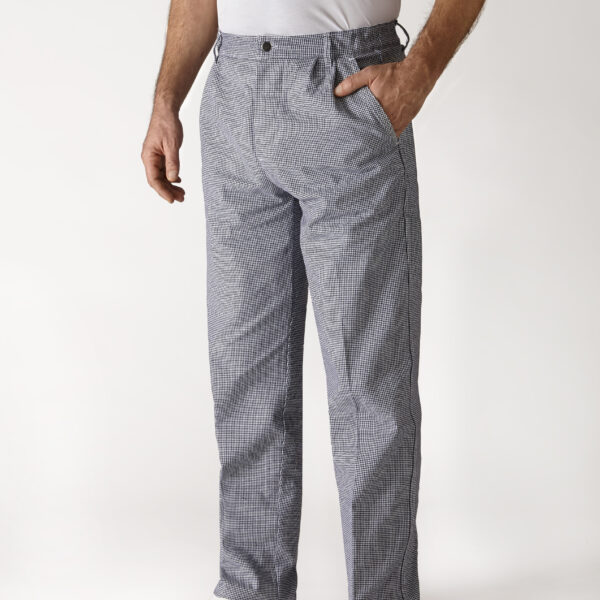 Tkanina: 100% bawełna 260 g/m2. Pasek z elastycznymi bokami + guzik. Rozporek na zatrzaski, włoskie kieszenie. 1 tylna kieszonka zapinana na zatrzask. Strzałkowe przeszycia na kolanach. Zawinięte nogawki.