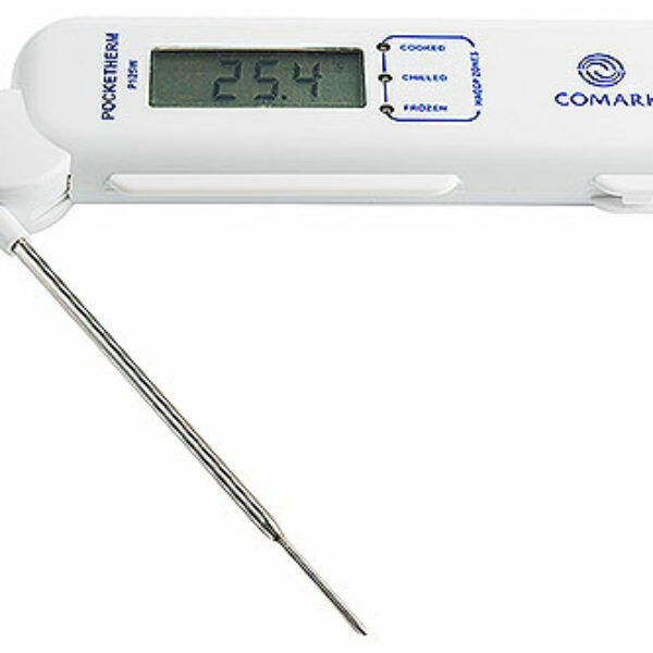 Termometr cyfrowy składany Comark®, zasilany na baterie, cyfrowy wyświetlacz, wysuwana igła ze stali nierdzewnej, pomiar w zakresie od -40 do +125 stopni Celsjusza. Opcje Frozen, Chilled i Cooked dla szybkiego testu HACCP.