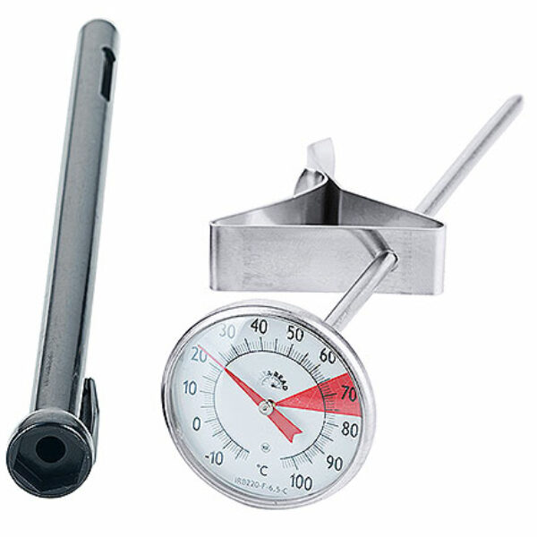 Termometr Barista, pomiar w zakresie od -15 do +100 stopni Celsjusza. Wykonany ze stali nierdzewnej z osłoną z poliwęglanu, dostarczany z klipsem.