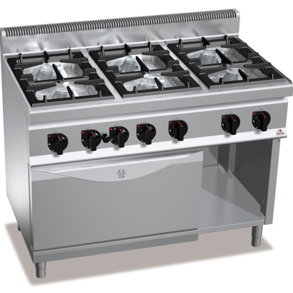 Kuchnia gazowa 6-palnikowa z piekarnikiem gazowym GN 2/1 i szafką, 49,8 kW, 1200x700x900 mm | BERTO'S, Macros 700, MAX-POWER, G7F6P+FG