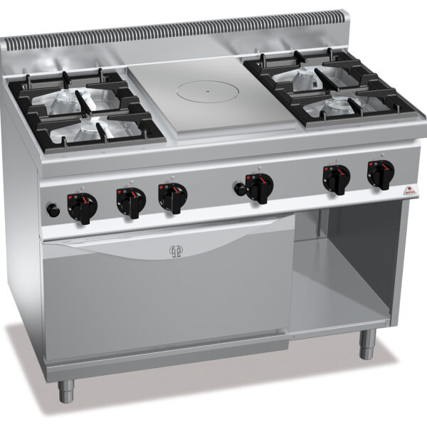 Kuchnia gazowa 4-palnikowa z płytą grzewczą i piekarnikiem gazowym GN 2/1 i szafką, 35,8 kW, 1200x700x900 mm | BERTO'S, Macros 700, HIGH POWER, G7T4P4