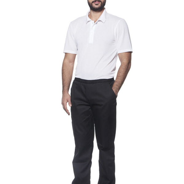 Spodnie męskie o prostym kroju z elastycznym pasem, wykonane z 65% poliestru i 35% bawełny. Posiadają dwie boczne kieszenie i jedną z tyłu. Można prać w pralce automatycznej w maksymalnej temperaturze do 60 stopni Celsjusza i prasować w temperaturze do 150 stopni Celsjusza. Nie wybielać, można suszyć w suszarce automatycznej w delikatnym programie. Można poddać profesjonalnemu czyszczeniu chemicznemu.