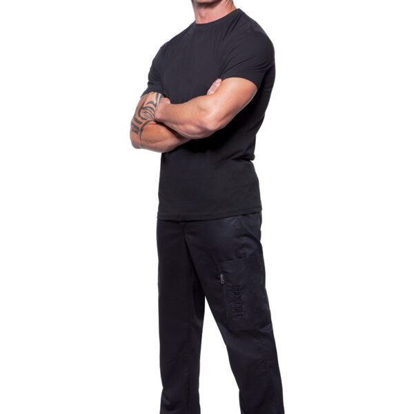 Spodnie męskie z elastycznym pasem wykonane ze 100% bawełny. Spodnie posiadają dwie kieszenie przednie i dwie kieszenie z tyłu oraz kieszeń na lewej nogawce zamykaną na zamek. Można prać w pralce automatycznej w temperaturze do 60 stopni Celsjusza i prasować w temperaturze do 150 stopni Celsjusza. Nie wybielać i nie czyścić chemicznie. Można suszyć w suszarce automatycznej w delikatnym programie.